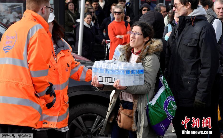 泰晤士水务公司表示,目前爆裂泄漏管道正在修复过程中,并已在受影响地区为居民建立了13000个瓶装水站。图为当地时间3月5日,工作人员在伦敦南部Balham卸载瓶装水。