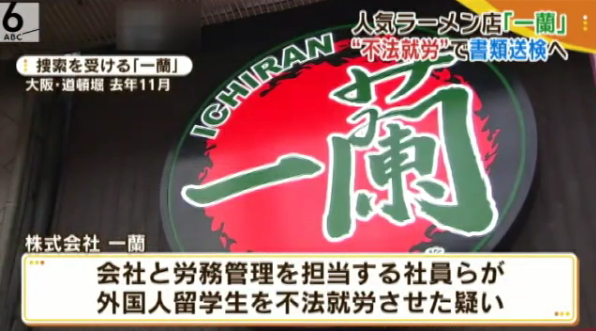 大阪警方于去年11月在道顿堀的一兰拉面店,逮捕了一名怀疑没有就职资格的越南籍女交换生,并到分店及女生租住的房子搜索。调查人员表示,约10名中国、越南等国的留学生于去年(2017年)秋天,在道顿堀两家一兰分店每周工作超出限定的28小时。