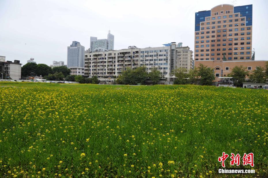 福州市鼓楼区五四路温泉大饭店原址种植的上万平方米的油菜花盛开,别具特色。张斌 摄