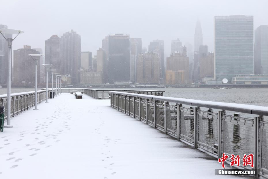 当地时间3月7日,美国纽约降下大雪,从东河观望曼哈顿中城雪景。中新社记者 廖攀 摄