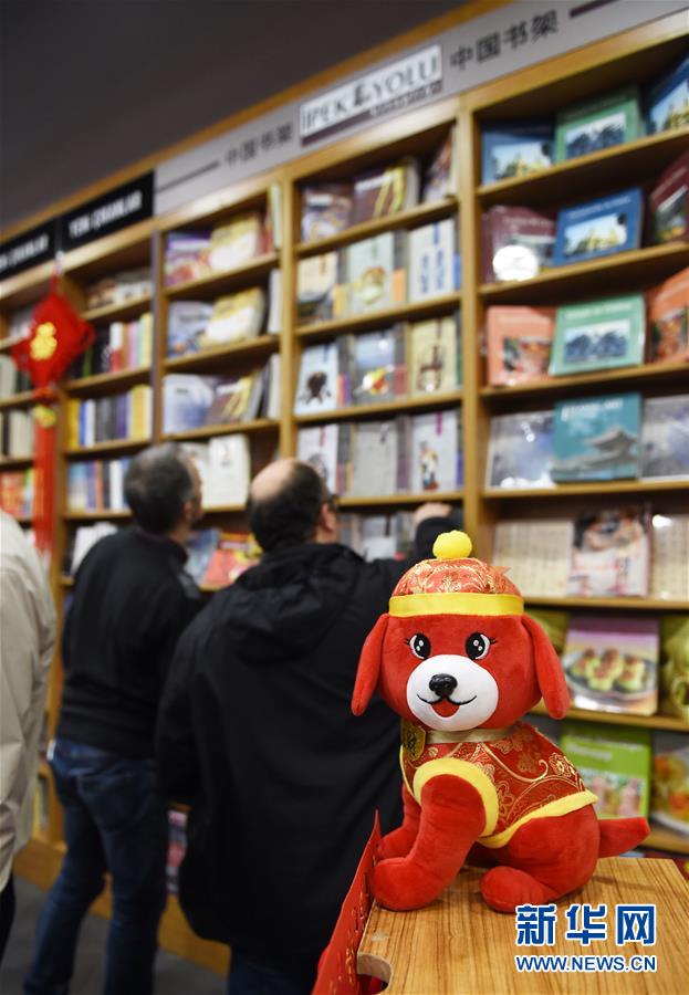 ​3月7日,在土耳其伊斯坦布尔,一个小狗吉祥物摆放在内齐赫书店“中国书架”前。 “中国书架”项目7日落户土耳其最大城市伊斯坦布尔内齐赫书店,这是中方深化两国文化交流的又一举措。 新华社记者贺灿铃摄