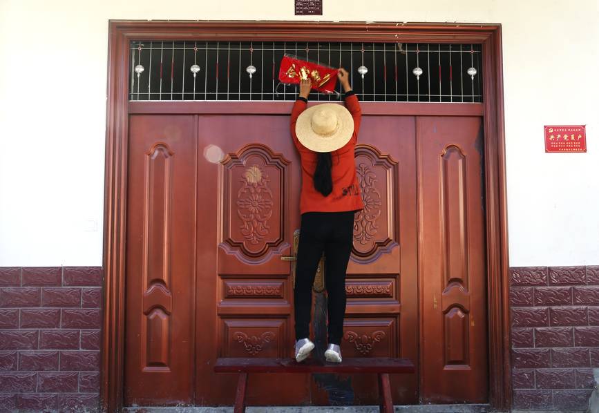 首先,与村民们息息相关的基础设施得到了改善,这里变化最明显的就是道路宽了,房子大了,田地种植多样化了,农民精神面貌提振了。图为一位刚嫁过来不久的新妇,正在清理气派的大门,准备贴上新对联。
