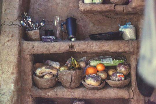 图为丹尼尔家中的厨房,摆放了大量的厨具和食物。食物是丹尼尔从外面购买的面包和水果等。隔断时间,丹尼尔就要到很远的商店购买食物。