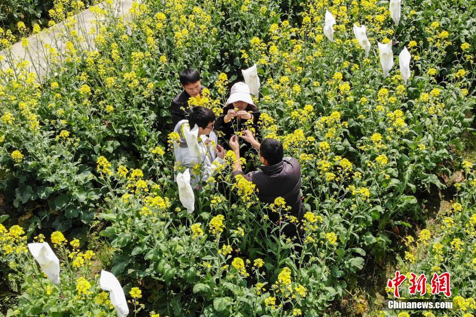 近日,游人如织的湖南农业大学耘园油菜花田遭到采摘与破坏。3月3日起,该校耘园油菜花田采取“闭门谢客”措施,以保证科研项目顺利进行。图为3月8日,学生们正在油菜花田中进行学习研究。 杨华峰 摄