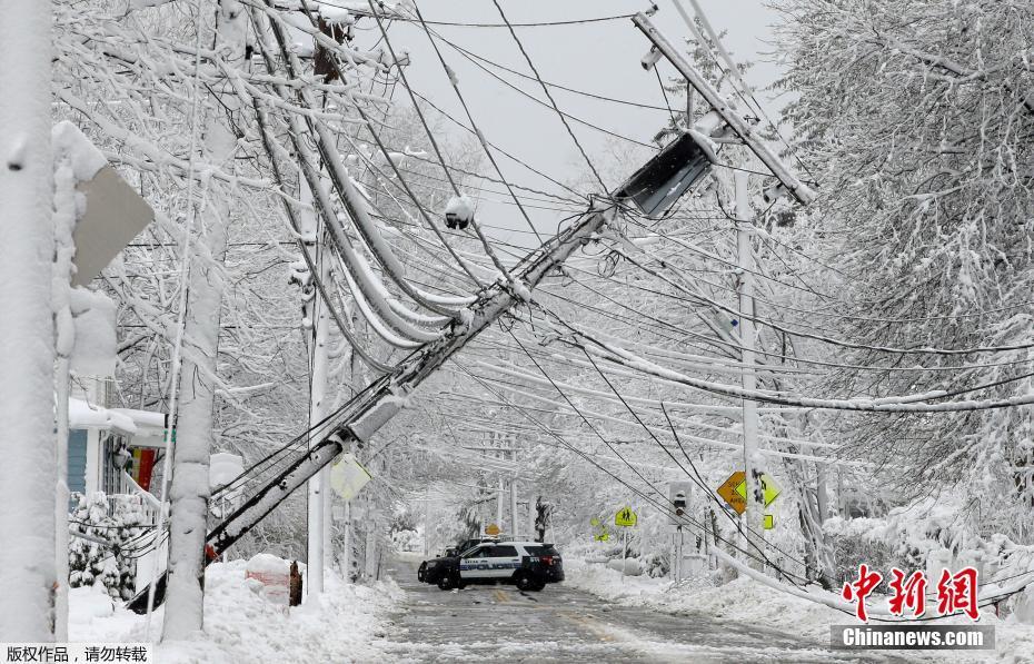 当地时间3月8日,美国马萨诸塞州电线杆因降雪导致倾倒。