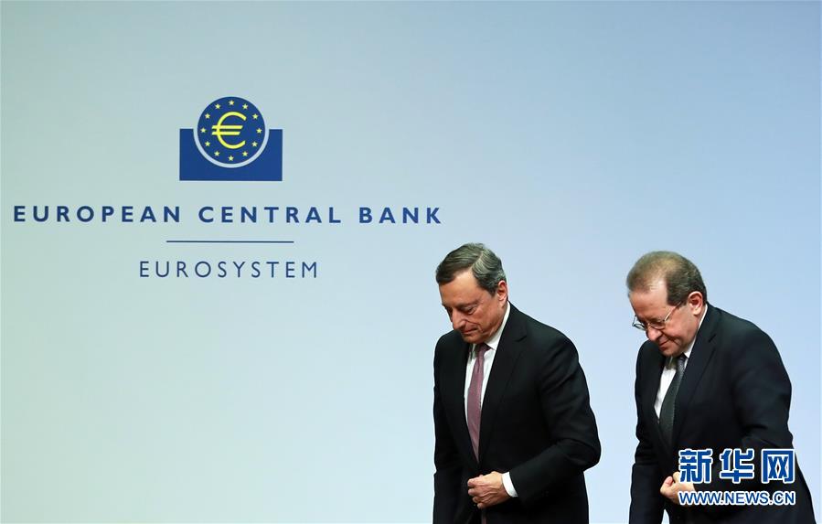 3月8日,在德国法兰克福的欧洲中央银行总部,欧洲央行行长德拉吉出席新闻发布会。欧洲中央银行8日在法兰克福召开今年第二次货币政策会议,决定维持当前利率水平和资产购买规模不变,但在货币政策声明中删除了在必要时可能扩大资产购买规模及延长期限的表述。新华社记者罗欢欢摄