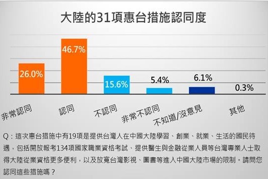 据台湾《东森新闻云》报道,对于“请问您认同这些措施吗”,有26%台湾民众表示“非常认同”,有46.7%民众表示“认同”。对于“请问您个人会想要去中国大陆就学、就业/创业或生活吗”,有13.2民众表示“非常想去”,有39.4民众表示“有点想去”。