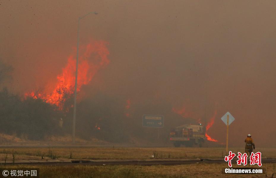 当地时间2018年3月10日,澳大利亚班伯里,失控的大火蔓延至班伯里东部地区,逼近附近的房屋,居民已被疏散。图片来源:视觉中国