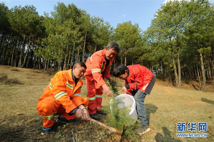 3月10日,沙子坡林场的护林员与他们的孩子在林区补植树苗。