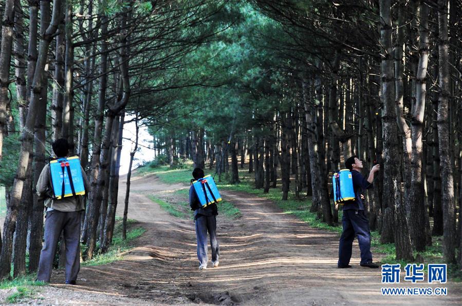 沙子坡林场的护林员在林区内喷洒药剂防治病虫害(2013年7月8日摄)。