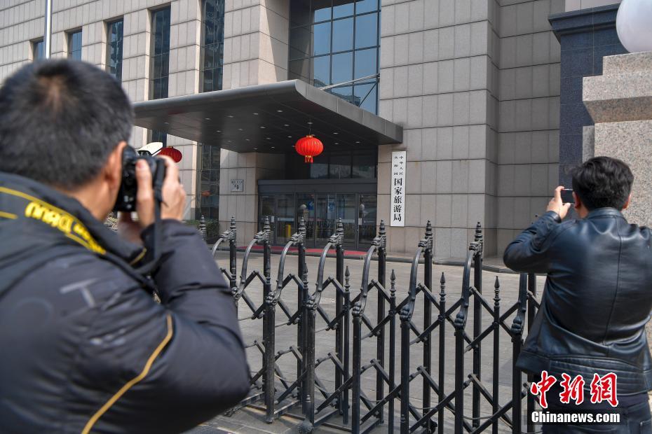 3月13日下午,民众在国家旅游局大门前拍照。当日,《国务院机构改革方案》提请十三届全国人大一次会议审议。方案提出,组建文化和旅游部,不再保留文化部、国家旅游局。 中新社记者 骆云飞 摄