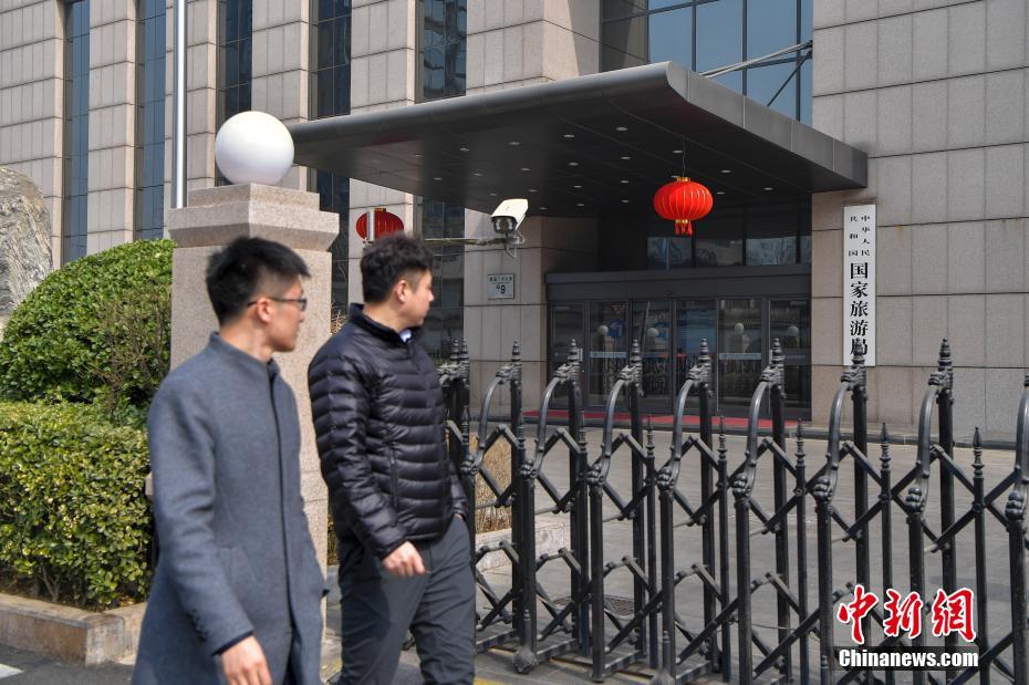 3月13日下午,民众从国家旅游局大门前走过。当日,《国务院机构改革方案》提请十三届全国人大一次会议审议。方案提出,组建文化和旅游部,不再保留文化部、国家旅游局。中新社记者 骆云飞 摄