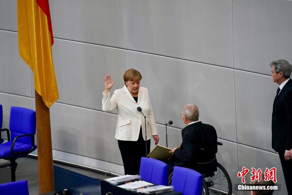 当地时间3月14日,德国联盟党领袖默克尔在柏林的联邦议院内面对联邦议长朔伊布勒宣誓就职新一任德国总理。这开启了她作为德国首位女总理的第四个任期。本次德国完成组阁距离2017年9月大选已近半年,下一次德国大选将于2021年举行。中新社记者 彭大伟 摄