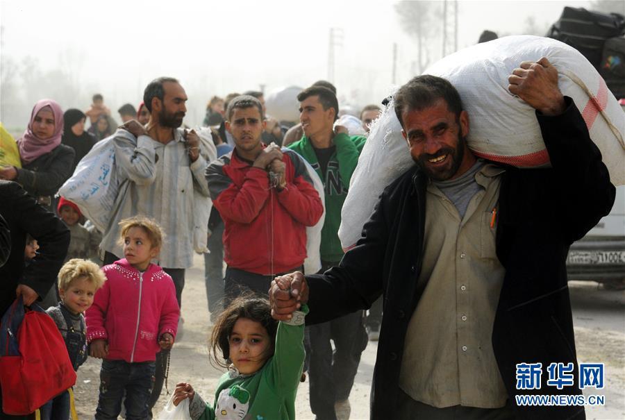 3月15日,在叙利亚大马士革东郊,被困平民从东古塔地区撤离。新华社发(阿马尔 摄)