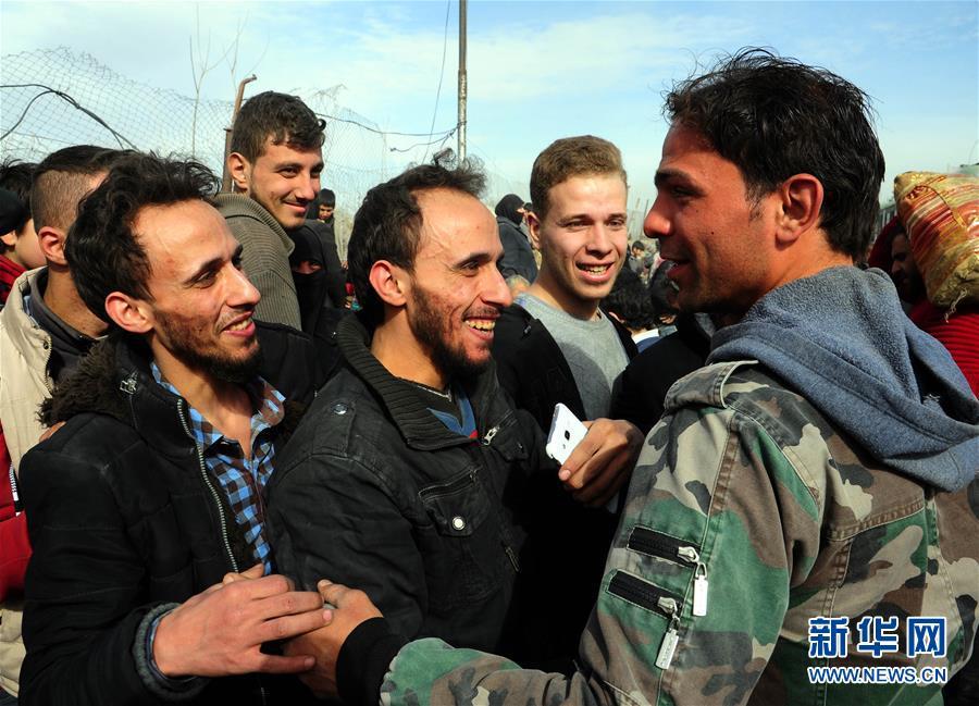 3月15日,在叙利亚大马士革东郊,撤离平民与政府军士兵交谈。新华社发(阿马尔 摄)