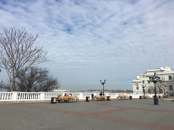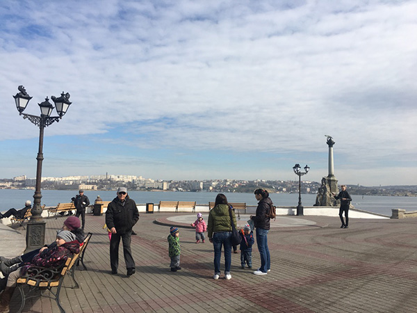 不过,与克里米亚半岛上的其他城市相比,如今的塞瓦斯托波尔仍然更显“体面”。在绵长的海边走廊,市容清洁车一寸一寸地来回清扫地面。青少年在海边的广场上玩滑板、溜旱冰、骑自行车,恍惚间,这个滨海城市与欧洲其他城市并无二致。游客们在海边拍照,远处的海鸥或静静浮在海面休息,或在广场上的游客脚边觅食。