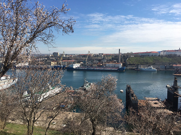 三月行走在塞瓦斯托波尔海湾,两岸夹道开满了粉色的樱花。天然良港之内,俄罗斯黑海舰队的航母和潜艇静静停泊。