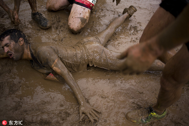 当地时间2018年3月16日,以色列特拉维夫市,选手参加泥地跑——10公里障碍挑战赛。