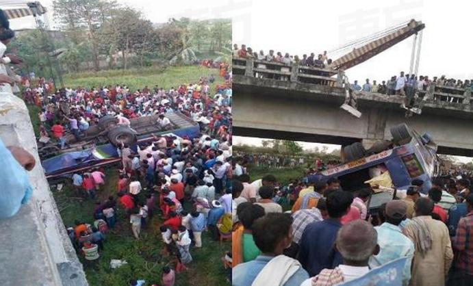 原标题: 印度一巴士疑因超载超速坠桥 致至少14死45伤(图)