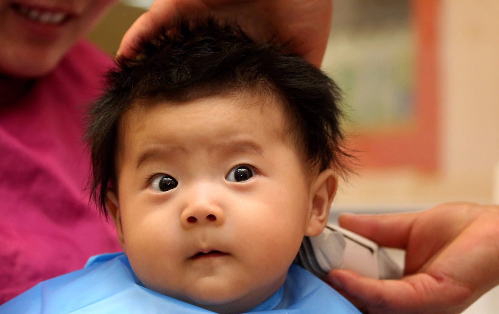 山东枣庄,一名小宝宝在一家婴幼儿理发店内“剃龙头”。