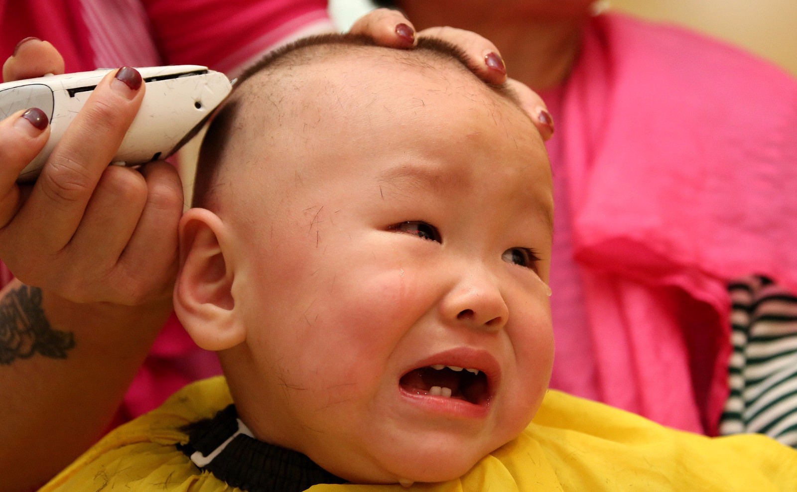 山东枣庄,一名小宝宝在一家婴幼儿理发店内“剃龙头”。