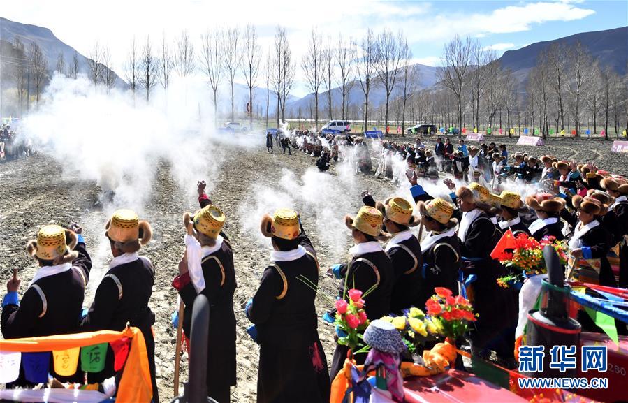 3月17日,山南市乃东区门中岗村村民把糌粑撒向天空,祈愿丰收吉祥。当日,西藏各主要农耕区农民举行传统盛大的春耕开犁仪式,祈求风调雨顺、五谷丰登。新华社记者 觉果 摄