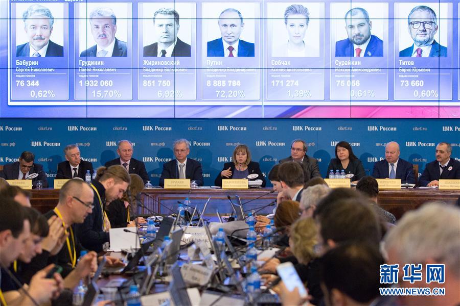 3月18日,在俄罗斯首都莫斯科,俄罗斯中央选举委员会主席帕姆菲洛娃(中)在新闻发布会上讲话。截至莫斯科时间18日21时,在俄罗斯选举机构统计的全俄21.33%的选票中,现任总统普京以71.97%的得票率在总统选举中领先。新华社记者 白雪骐 摄