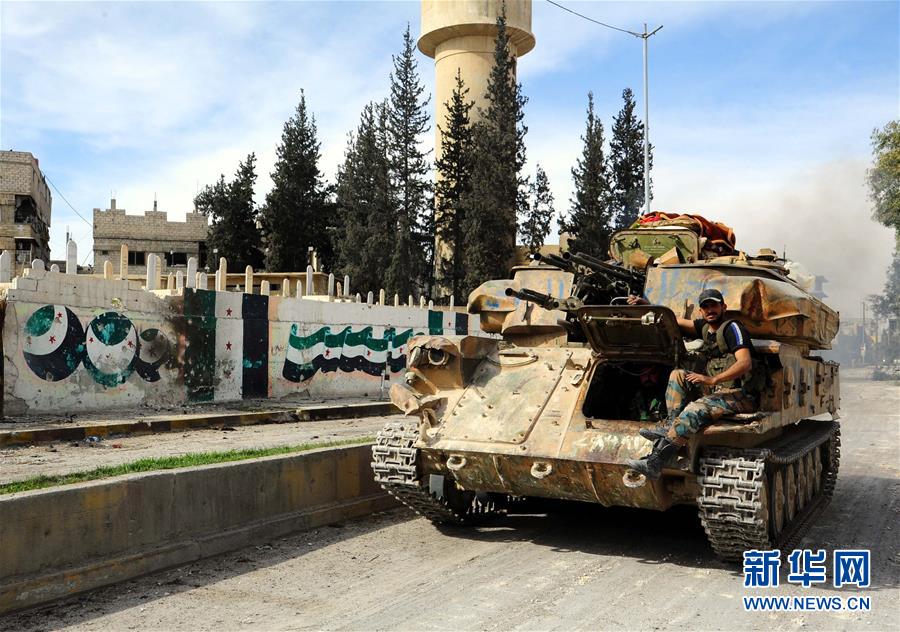 3月18日,叙政府军坦克在东古塔地区的萨格巴经过一面涂有反政府武装旗帜的墙。东古塔地区是叙反政府武装在大马士革郊区的重要据点。近期,叙政府军和反政府武装在该地区的冲突升级。据叙军方消息,目前政府军已收复东古塔百分之八十土地。新华社发(阿马尔 摄)