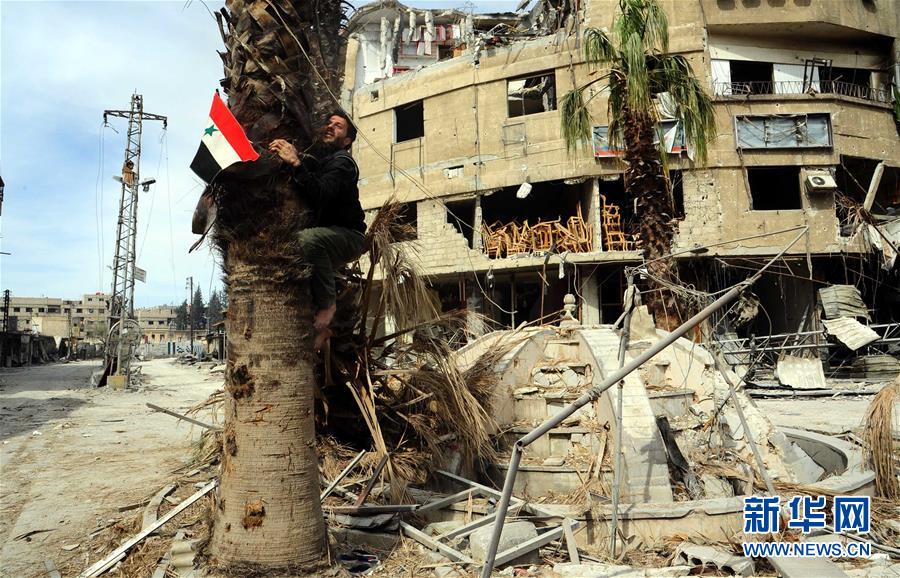 3月18日,一个男子在东古塔地区的萨格巴爬上树升叙利亚国旗。东古塔地区是叙反政府武装在大马士革郊区的重要据点。近期,叙政府军和反政府武装在该地区的冲突升级。据叙军方消息,目前政府军已收复东古塔百分之八十土地。新华社发(阿马尔 摄)