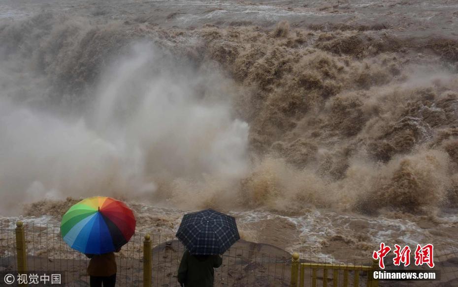2018年3月17日,山西临汾,游客在吉县黄河壶口瀑布欣赏“桃花汛”。受上游融冰开河影响,山西吉县黄河壶口瀑布迎来 “桃花汛”。壶口瀑布水量骤增,每秒流量达到2440立方米,形成壮美瀑布群。“桃花汛”是指每年三月下旬到四月上旬,黄河内蒙古段冰凌消融形成春汛。当其流至下游时,由于恰逢沿岸山桃花盛开,故被称为“桃花汛”。 图片来源:视觉中国