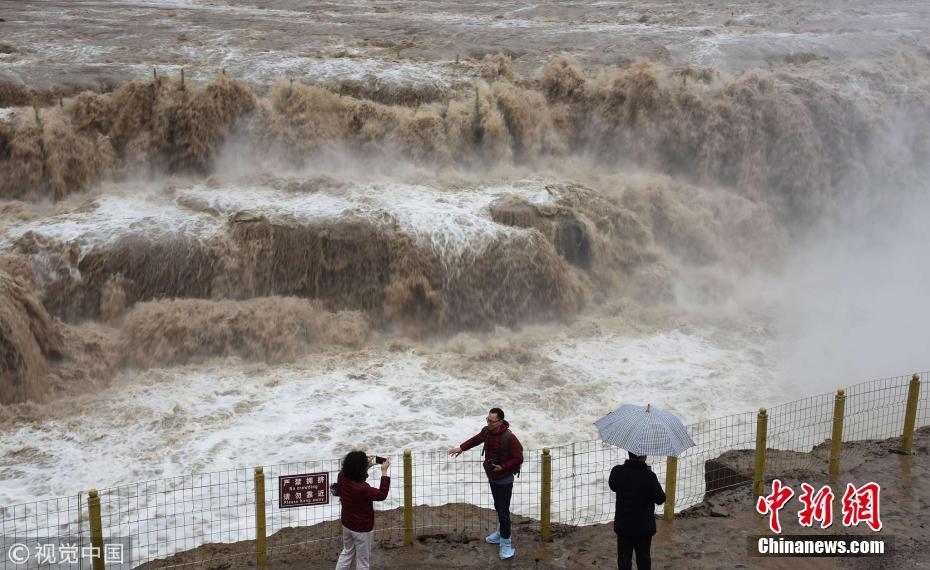 2018年3月17日,山西临汾,游客在吉县黄河壶口瀑布欣赏“桃花汛”。受上游融冰开河影响,山西吉县黄河壶口瀑布迎来 “桃花汛”。壶口瀑布水量骤增,每秒流量达到2440立方米,形成壮美瀑布群。“桃花汛”是指每年三月下旬到四月上旬,黄河内蒙古段冰凌消融形成春汛。当其流至下游时,由于恰逢沿岸山桃花盛开,故被称为“桃花汛”。 图片来源:视觉中国