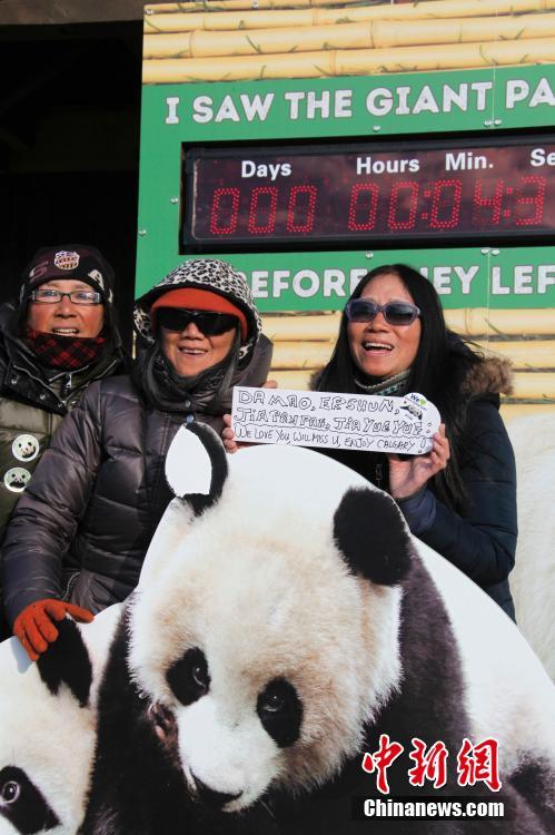 当地时间3月18日,民众手持祝福语在多伦多动物园的倒计时牌前留影,为中国租借给加拿大的4只大熊猫送行。大熊猫们即将从加国第一大城市多伦多迁居至石油城卡尔加里,当日是它们在多伦多与公众见面的最后一天。大熊猫“大毛”和“二顺”于2013年3月25日来到加拿大。按照中加双方的协议,它们要在多伦多和卡尔加里各居住5年。2015年10月,接受了人工授精的“二顺”在多伦多产下双胞胎“加盼盼”、“加悦悦”。中新社记者 余瑞冬 摄