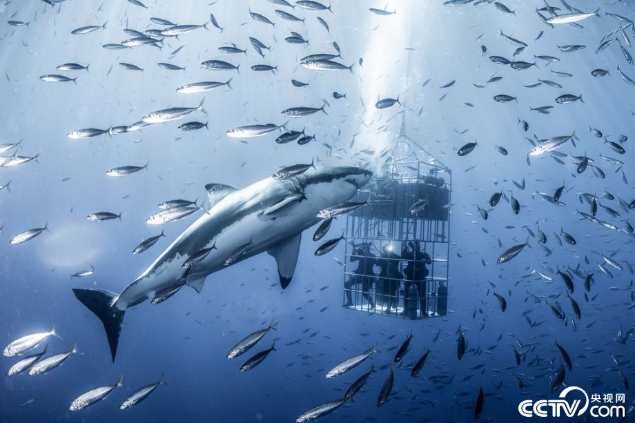 近日,墨西哥瓜达卢佩群岛,一条6米长、两吨多重的大白鲨穿过在一群亮闪闪的鲭鱼,靠近了承载着研究人员的笼子,一直绕笼子盘旋。人类体型与之相较实在不值一提。35岁的水安全专家约翰·马厄(John Maher)为一个鲨鱼研究项目拍摄了这些照片。他来自加利福尼亚州拉霍亚,乘船一天多才到达瓜达卢佩岛附近的水域,花了三天时间记录下各种大白鲨。 视觉中国