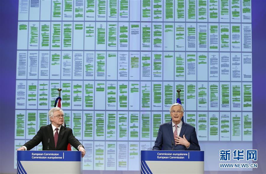 3月19日,在比利时布鲁塞尔欧盟总部,英国“脱欧”事务大臣戴维斯(左)与欧盟首席“脱欧”谈判代表巴尼耶出席新闻发布会。欧盟与英国19日公布了一份有关英国“脱欧”过渡期安排的协议草案,宣布已就其中大部分条款达成一致,有望在欧盟春季峰会上获得通过。新华社记者 叶平凡 摄