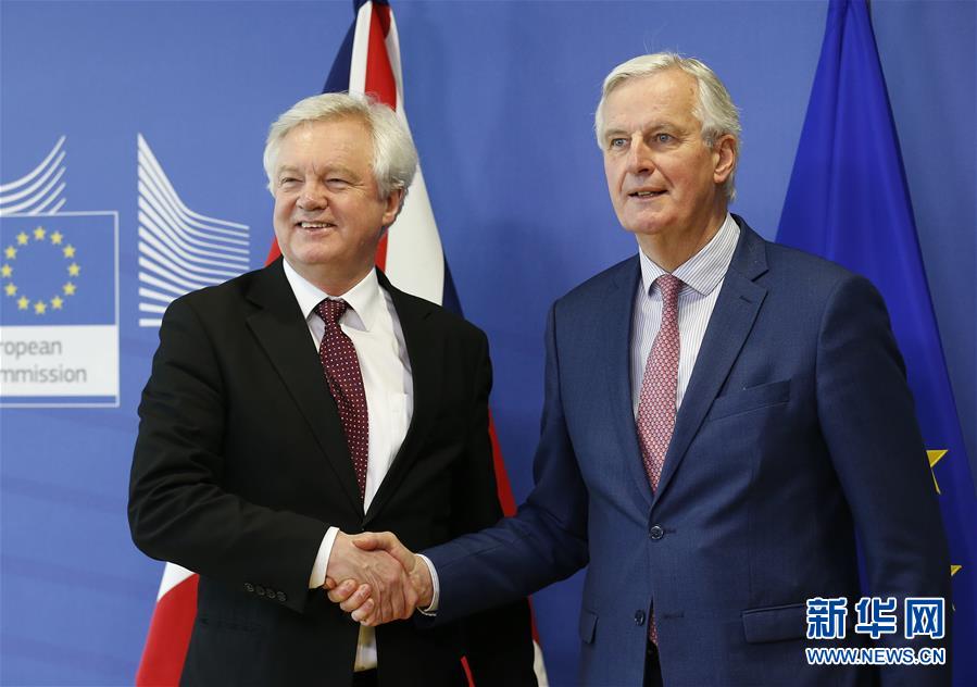 3月19日,在比利时布鲁塞尔欧盟总部,英国“脱欧”事务大臣戴维斯(左)与欧盟首席“脱欧”谈判代表巴尼耶会谈前握手。欧盟与英国19日公布了一份有关英国“脱欧”过渡期安排的协议草案,宣布已就其中大部分条款达成一致,有望在欧盟春季峰会上获得通过。新华社记者 叶平凡 摄