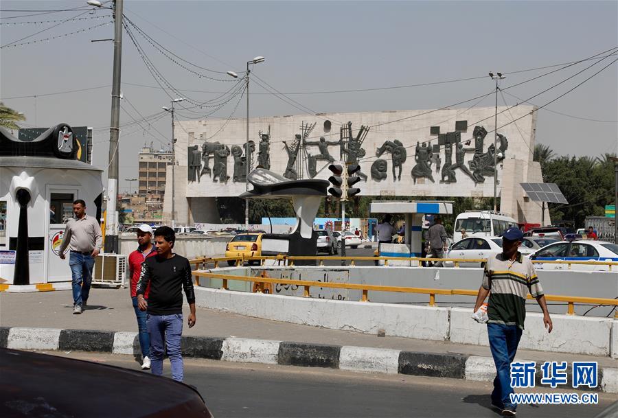 3月20日,在伊拉克巴格达,几名当地行人经过解放广场。今年3月20日是伊拉克战争爆发15周年。新华社发(哈利勒·达伍德 摄)