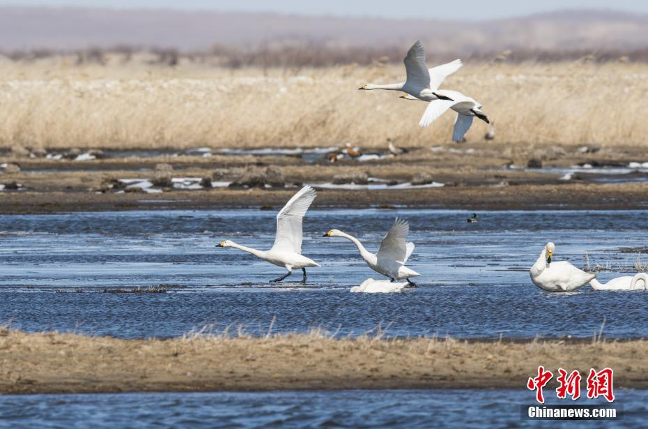 3月20日,天鹅在湖面上栖息。日前,内蒙古自治区呼伦贝尔市陈巴尔虎旗陆续迎来大量北归天鹅。据了解,每年四月份,成群的天鹅从中国南方迁徙到呼伦贝尔产卵繁殖,而今年三月中旬起,陈巴尔虎旗境内便迎来大量回归天鹅,实属罕见。中新社记者 武军 摄