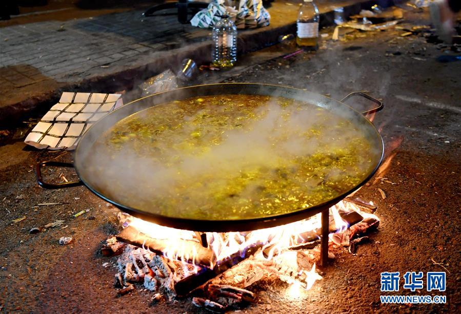这是3月18日夜在西班牙巴伦西亚法雅节海鲜饭大赛上拍摄的正在烹制的海鲜饭。新华社记者郭求达 摄