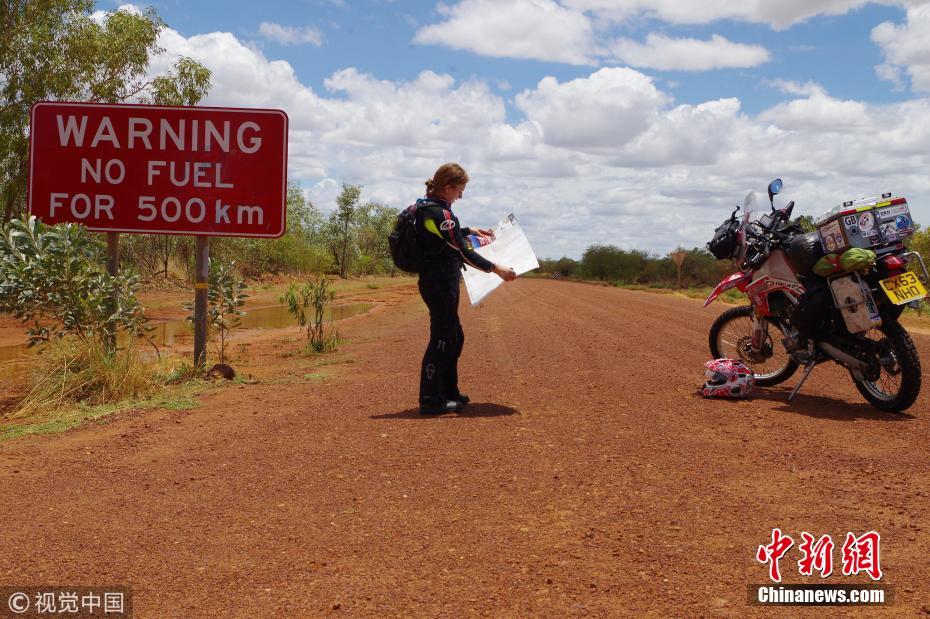 42岁的斯蒂芬·杰文斯是第一个骑摩托车走遍七大洲的英国人。2014年,她变卖了家产,骑上一辆排量250cc的越野摩托车从威尔士北部的康威出发,整个行程将近80000英里(约13万公里)。斯蒂芬刚出发时还只是一位母亲。当她旅行到印度时,就已经成为了祖母。她说:“我18岁时第一次产生想去旅行的念头,当时只想去婆罗洲看猩猩。”图为斯蒂芬·杰文斯在澳大利亚。 图片来源:视觉中国