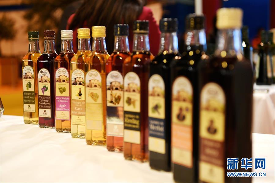 3月21日,参展商在西班牙马德里世界橄榄油博览会上展示橄榄油。新华社记者郭求达摄