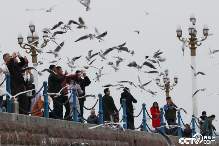 2018年3月20日,人们在山东省青岛栈桥景区赏海鸥。春分节气将至,在青岛栈桥越冬的红嘴鸥集中进入繁殖期,头部开始换羽白头变黑头,网友戏称是为了迎接交配期而换上“婚装”, 换羽之后红嘴鸥将陆续踏上返回西伯利亚的归途,以繁衍后代。赏海鸥时日不多,许多人来到栈桥喂食,成千上万只红嘴鸥如同阵阵白色旋风,时而盘旋时而俯冲,与人同乐,情景十分壮观。 视觉中国