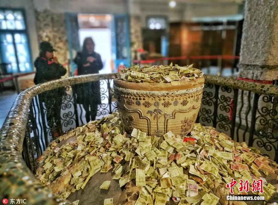 2018年3月21日,天津一著名景点内,参观的游客纷纷向景点内的各处投撒钱币,掷币祈福。由于数量较多,堆积起来的钱币甚是显眼,成了独特的“风景”。 图片来源:东方IC 版权作品 请勿转载