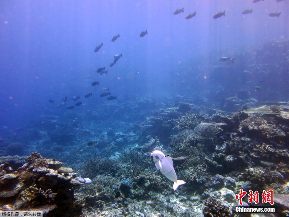 麻省理工大学研究团队近日公开了他们研发的首款可长时间在水中自主游动的机器鱼SoFi在斐济进行水下测试。SoFi大部分部件是3D打印的,尾部柔性塑料和硅胶制成,配合鱼鳍,可模仿真实鱼类的游动动作,以重量舱和”浮力控制单元“来实现上浮和下潜,在任天堂控制器和声学通信系统引导下,它可在水下超过50英尺的地方游动40分钟左右。SoFi可更好地接近海洋生物且不造成干扰,或将成为海洋研究的新工具。图为2015年8月拍摄的SoFi在水下进行测试的照片。