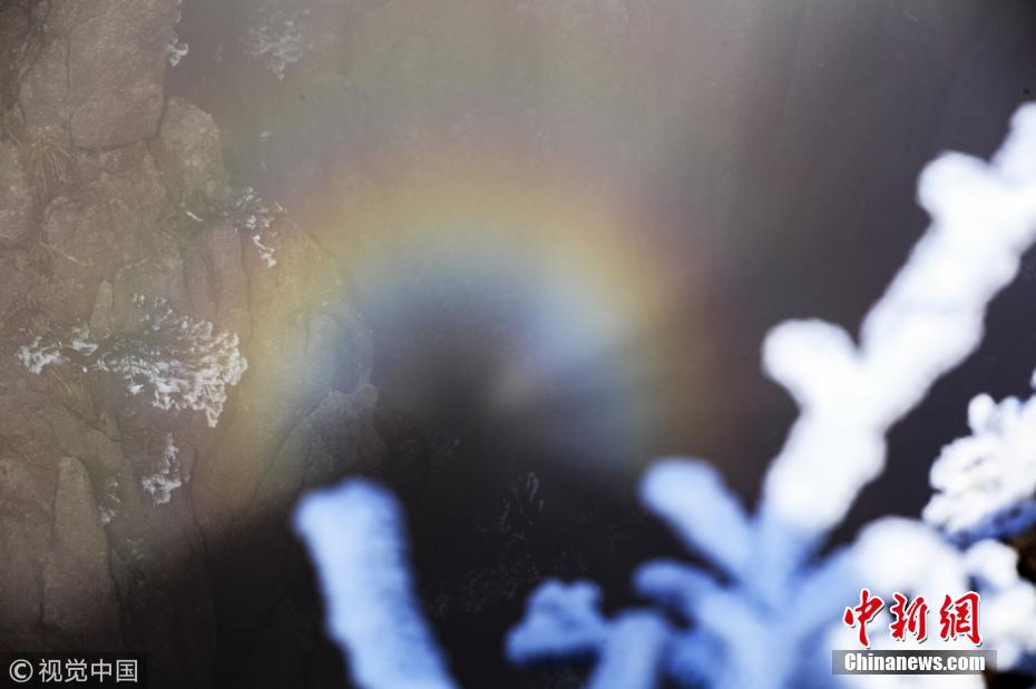 2018年3月21日,安徽黄山风景区同现春雪、雾淞、云海气象景观。当天下午,银妆素裹的莽苍大山,惟妙惟肖的奇松怪石,烟波浩渺的云海仙境,神奇诡秘的佛光美景,把中外游客带入如诗如画的幻境之中。  图片来源:视觉中国
