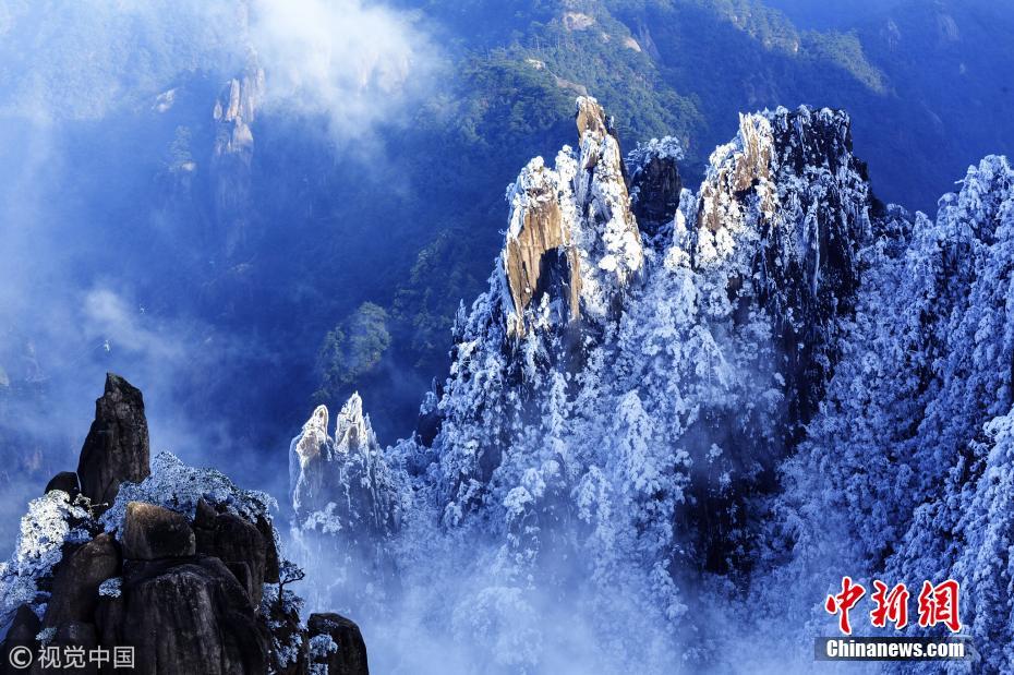 2018年3月21日,安徽黄山风景区同现春雪、雾淞、云海气象景观。当天下午,银妆素裹的莽苍大山,惟妙惟肖的奇松怪石,烟波浩渺的云海仙境,神奇诡秘的佛光美景,把中外游客带入如诗如画的幻境之中。  图片来源:视觉中国