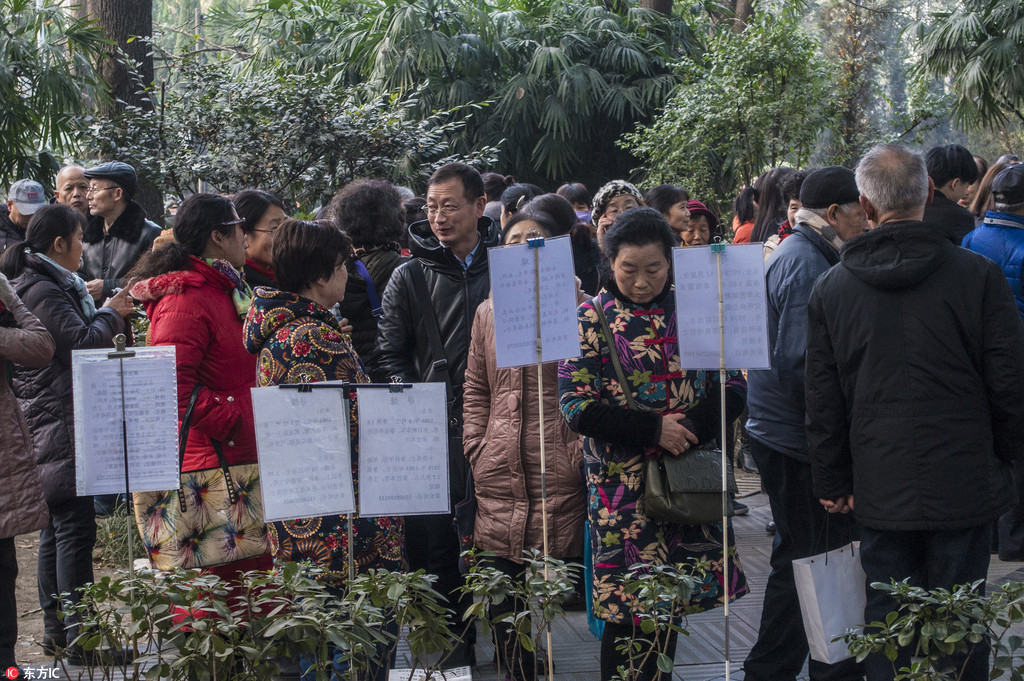 2018年1月17日,四川成都。成都人民公园小树林的相亲角形成已有时日,许多父母希望自己子女能在过年前脱单,公园扎堆为儿女相亲。
