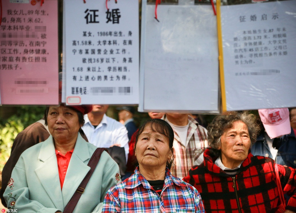 近日,深圳莲花山公园恋爱角,一位白发老人为70后女儿征婚,要求对方学历相当、无婚史,但能找到就找,不是非要结婚。一旁的大妈悔称:现在看来大学的时候就该鼓励孩子找一个对象,不管男的女的。图为2018年3月10日,广西南宁,一公园九曲桥凉亭广场的“相亲角”人气爆棚,像赶圩一样热闹。众多白发苍苍的老人聚集于此,拿出精心为儿女准备的“求偶简历”在这里悬挂,期待着为儿女寻来一份良缘。家长们细细地看着每一份求亲简历,生怕一疏忽就让子女错过一段良缘。(图片来源:东方IC)
