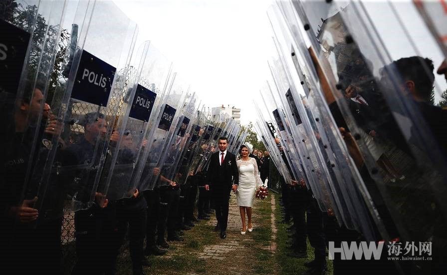 他们的婚礼由警局同事操办,同事们举着防弹盾牌,护送这对新人走向礼台。