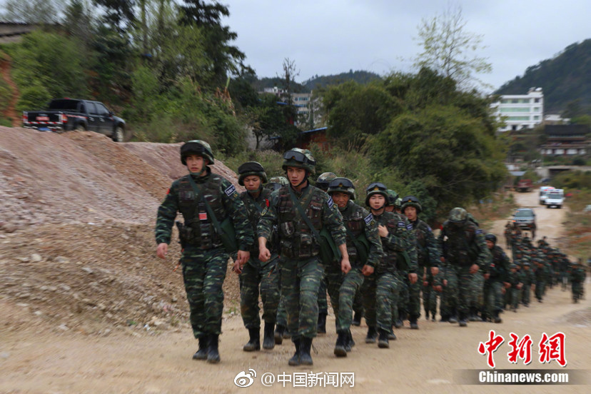 21日,武警贵州总队开展"魔鬼周"极限训练活动,几名放学回家的小朋友偶遇行军途中的"武警叔叔"。(来源:中新网)