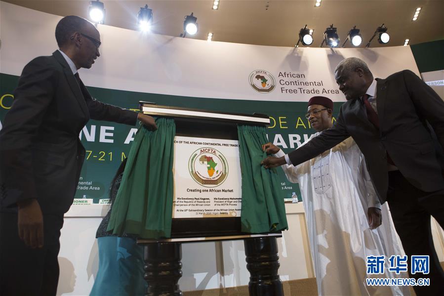 3月21日,在卢旺达首都基加利,非盟轮值主席、卢旺达总统卡加梅(左一)、尼日尔总统优素福(右二)与非盟委员会主席法基为非洲大陆自由贸易区揭牌。非洲44个国家21日在卢旺达首都基加利举行的非洲联盟(非盟)首脑特别会议上签署成立非洲大陆自由贸易区协议。新华社发(加布里埃尔·杜萨贝 摄)